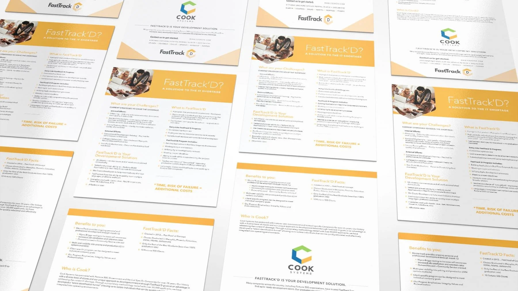 From brand identity to sales collateral, the RocketFuel team partnered with Cook Systems on a variety of projects over the course of 2+ years. Our ever-evolving objectives included generating brand awareness via search marketing, driving training class enrollment via social media advertising, as well as designing printed sales sheets and brochures for flagship programs, like FastTrack'D and Cloud Consulting.