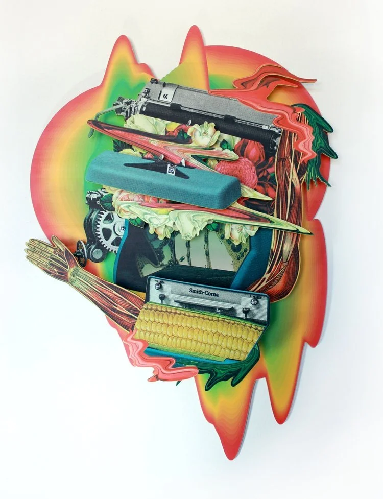 Lush Interiors is a collection of mixed media works aimed at exploring “sensual machines,” a term St Francis Elevator Ride uses to describe the mechanized trappings of modern life, as we all become increasingly enmeshed with our gadgetry. Common household appliances burst apart to reveal human anatomy and vegetation, both in various states of bloom and decay. From a distance, the works appear as vibrantly colored, otherwordly scenes, but a closer viewing reveals grim details: human teeth and headless birds, rotting tissue and melting organs.