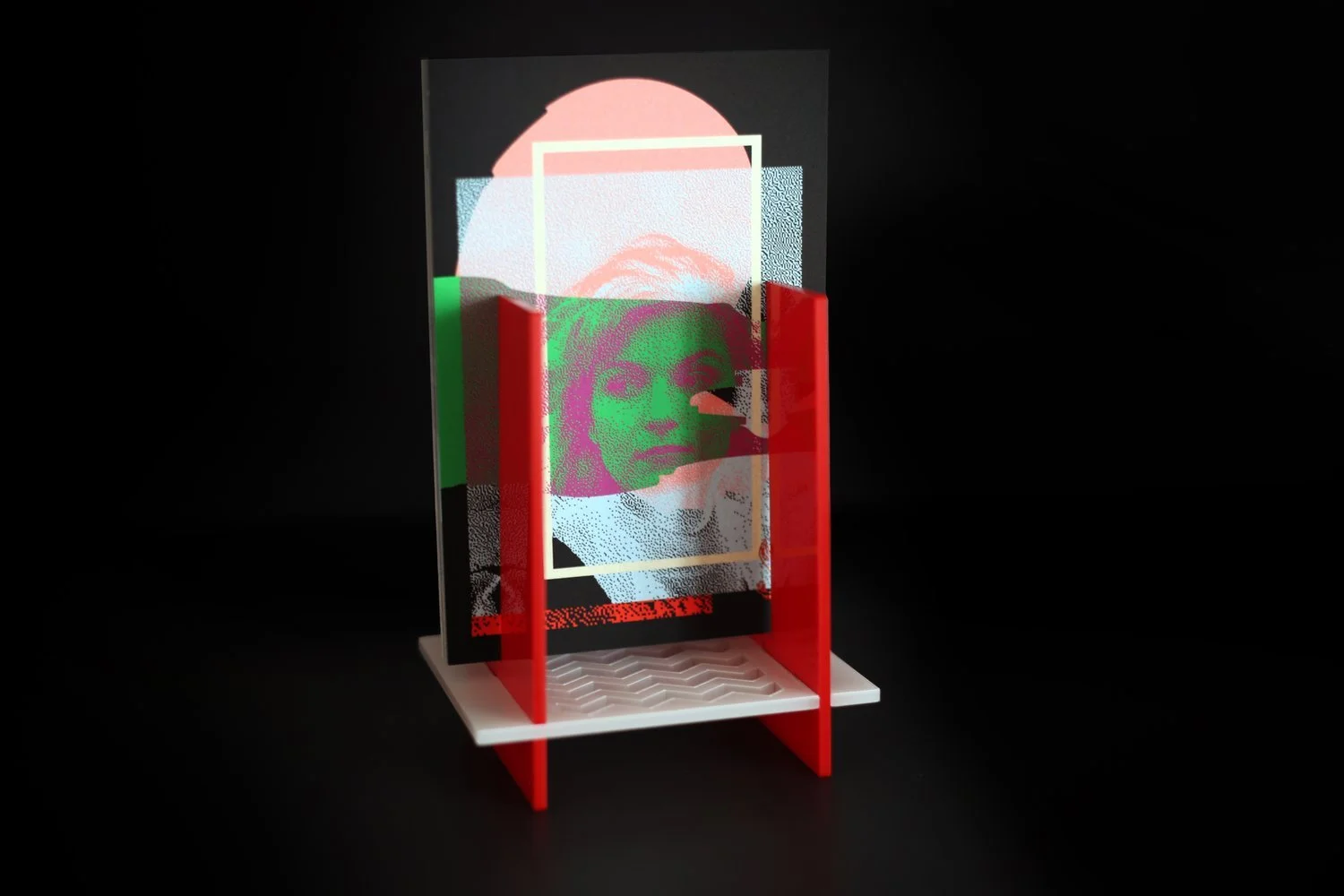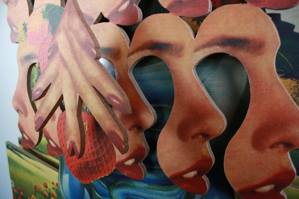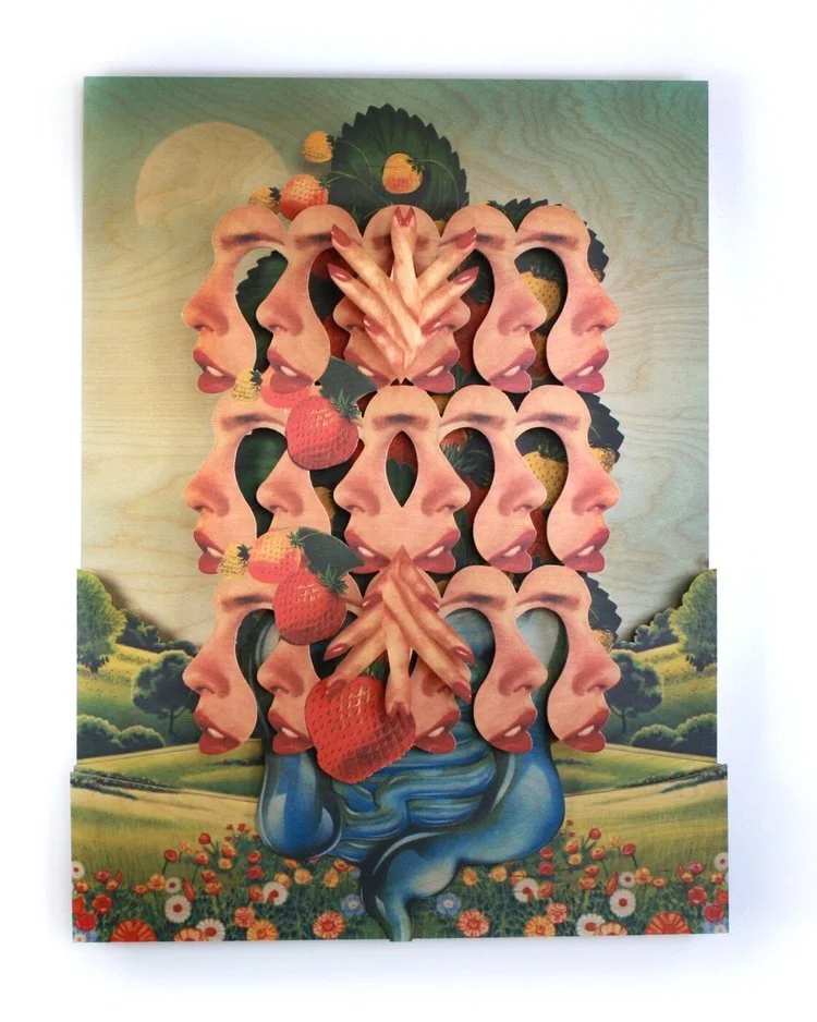 Lush Interiors features direct-to-substrate collage prints on birch plywood. The prints are intricately milled and cut by a CNC router, and then the multilayered, three-dimensional pieces are assembled using common hardware components, like nuts and bolts.