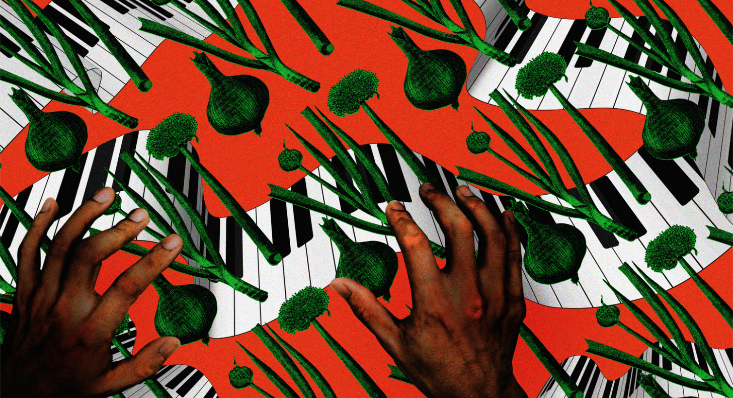 Saturated red-orange and green, a veggie nod to the original album cover, keyboard snaking through the groove to its own beat.